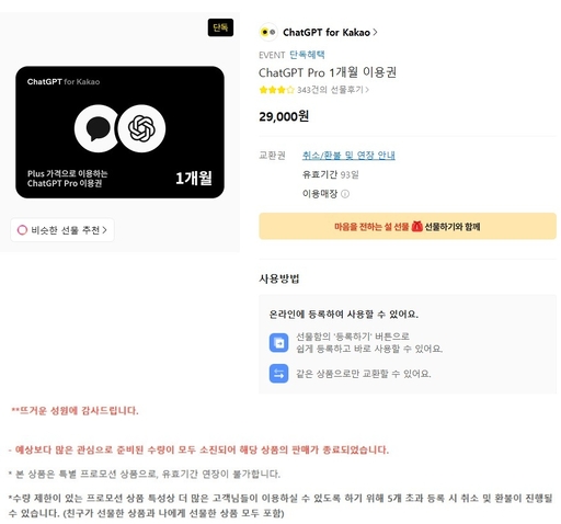 15일 업계에 따르면 지난 12일부터 카카오톡 선물하기에서 판매 중이던 '챗GPT Pro 1개월 이용권'(2만9000원)은 전날 오후 준비 수량이 모두 소진됐다.