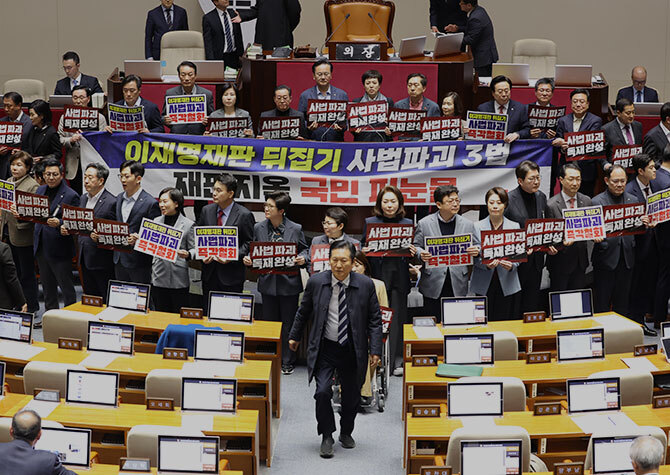 국민의힘 의원들은 '이재명재판 뒤집기 사법파괴 3법 재판지옥 국민 피눈물'이란 문구의 현수막과 함께 '사법파괴 독재완성', '사법파괴 즉각철회'라고 적힌 손팻말을 들고 의장석 앞에 섰고 민주당 의원들이 거세게 항의하면서 고성이 오갔다.