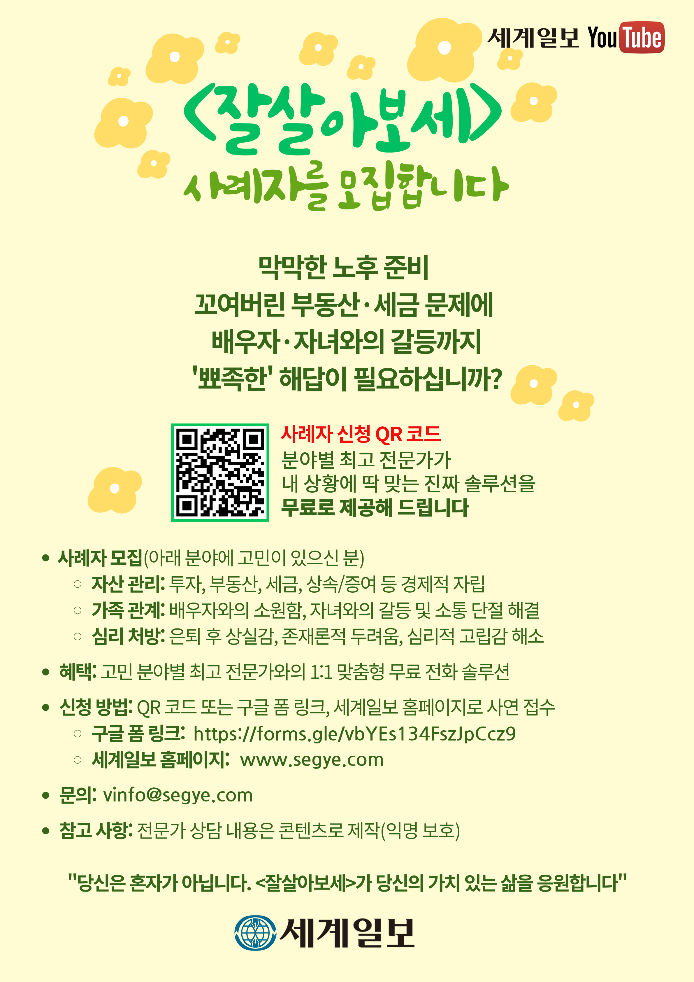 세계일보가 새롭게 선보이는 유튜브 콘텐츠 <잘살아보세>는 이런 현실적인 고민을 함께 나누고, 전문가의 도움을 통해 실질적인 해법을 찾아가는 프로그램입니다.