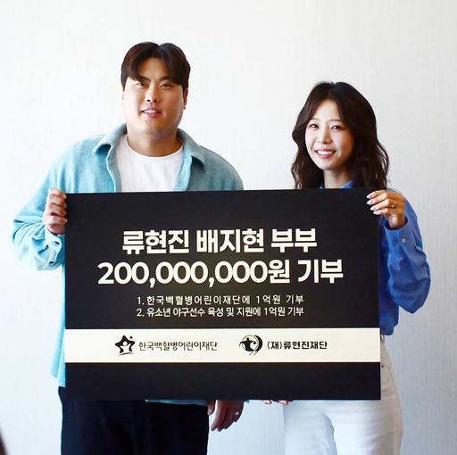 프로야구 한화 류현진과 배지현 전 아나운서 부부가 류현진의 프로 데뷔 20주년을 기념해 2억원을 기부했다고 류현진 재단이 9일 밝혔다.