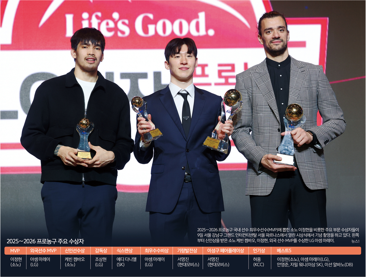 이날 시상식의 가장 빛나는 주인공인 국내 최우수선수(MVP)의 영예는 고양 소노 가드 이정현에게 돌아갔다. 이정현은 기자단 총 유효 투표 117표 중 106표라는 압도적인 지지를 얻으며 생애 첫 MVP 트로피를 품에 안았다. 2023년 창단한 소노가 배출한 구단 첫 MVP다. 베스트5까지 선정된 그는 이번 시상식 ‘2관왕’에 오르며 명실상부한 리그 최고의 스타로 우뚝 섰다.