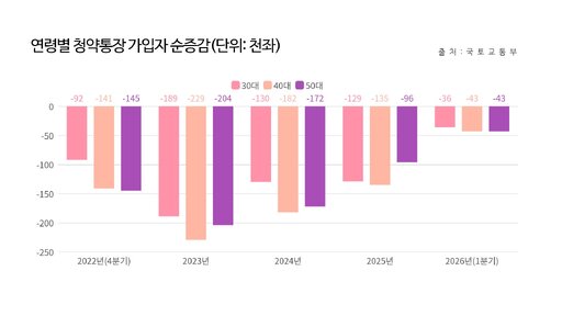 올해 1분기 청약통장 가입자 수가 10만 명 가까이 순감소한 것으로 나타났다. 주택 시장의 주 수요층인 30대 이상과 수도권 거주자를 중심으로 가입자 이탈 현상이 이어지는 모습이다.
