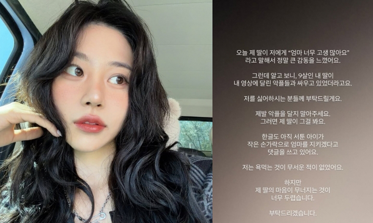 그는 “나를 싫어하시는 분들께 부탁드린다. 제발 악플을 달지 말아 달라. 그러면 내 딸이 그걸 본다”며 “아직 한글도 서툰 아이가 엄마를 지키겠다고 작은 손가락으로 댓글을 쓰고 있다”고 호소했다.