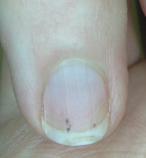 6. 검은 세로줄이 생긴 손톱 손톱에 검은색 또는 어두운 색의 세로 라인이 생겼다면 흑색종을 의심해봐야 한다. 흑색종은 피부암 중에서도 사망률이 높은 질병이다.