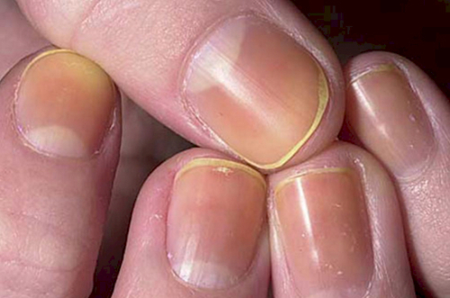 3. 노르스름한 손톱 간 질환이나 황달, 폐 기능 저하를 의심해봐야 한다. 손톱에 무좀이 생겼을 때도 노르스름한 색으로 변하게 되는데 이 경우 손톱이 두꺼워지면서 부서지기도 한다.