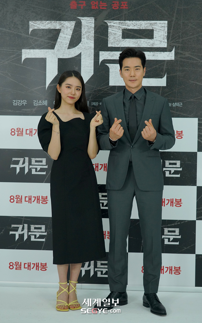 배우 김소혜(사진 왼쪽)와 김강우가 19일 온라인 생중계로 진행된 영화 '귀문'의 제작발표회에 참석해 포즈를 취하고 있다.