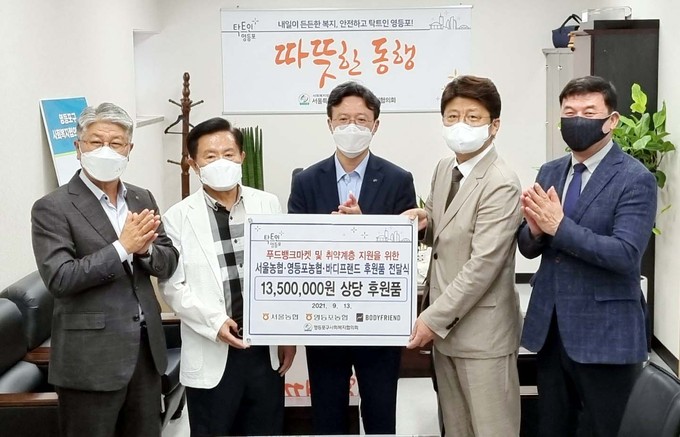 농협 서울지역본부(본부장 이대엽)와 ㈜바디프랜드(대표 박상현)는 13일 서울 영등포구청에 홍삼, 간편식, 잡곡, 장세트 등 생필품을 담은「우리 농축산물 행복나눔상자」 50박스와 영등포농협(조합장 이정택)에서 제공한 쌀 1000KG, 「바디프랜드 안마의자」 2대를 전달한다고 밝혔다.