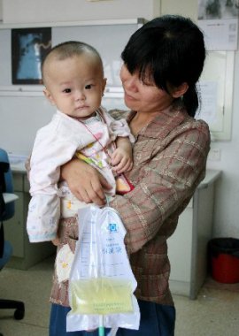| △지난 16일 멜라민이 함유된 산루사의 분유를 먹고 결석 증세를 보인 아이가 병원에서 치료를 받고 있다. <신화통신> |