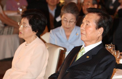 | ◇김대중 전 대통령 내외가 11일 오후 여의도 63빌딩에서 열린 6·15 남북공동선언 9주년 기념식에서 당시 특별수행원이었던 문정인 연세대 교수의 강연을 듣고 있다. 연합뉴스 |