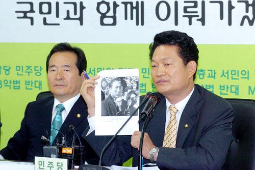 | 민주당 송영길 최고위원이 12일 오전 서울 여의도 당사에서 열린 확대간부회의에서 2005년 사학법 처리 반대 장외집회에 참석했던 이명박 대통령의 사진을 들어 보이며 언론의 균형있는 보도를 부탁하고 있다. <민주당 제공> |