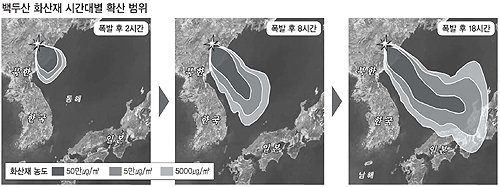 | ◇겨울철 백두산 분화로 치솟은 화산재의 시뮬레이션 모습. 화산재는 분화 2시간 만에 북서풍을 타고 백두산에서 남쪽으로 함경남도 신포·동쪽으로 함경북도 청진 부근까지 덮친다. 이어 8시간 후에는 울릉도와 독도를, 18시간 후에는 일본을 지나 태평양으로 확산한다. 국립방재연구소 제공 |