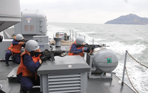 북한의 연평도 포격도발 1년을 하루 앞둔 22일 서해 연평도 인근 해상에서 실시된 긴급출동 훈련에 참가한 해군 2함대 고속정 장병들이 K-2소총을 겨누며 철통경계를 하고 있다.