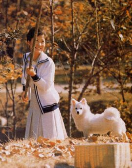 | 박근혜 후보가 과거 자신이 기르던 강아지 ‘방울이’와 함께 산책하고 있다. 출처=박근혜 후보 미니홈피 |