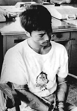 | 유치장 탈주범 최갑복이 1990년 7월31일 경찰 호송버스 쇠창살을 뜯고 탈출했다가 이틀 만에 붙잡혀 경찰조사를 받고 있다. 대구=연합뉴스 |