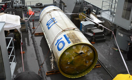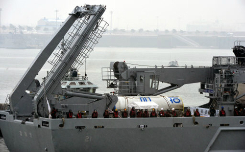 | 14일 서해에서 인양된 북한 로켓 은하 3호의 1단 추진체로 추정되는 잔해물이 청해진함에 실려 있다. 평택=이재문 기자 |