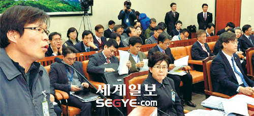 | 국회 중재도 무위로 국회 환경노동위원회가 27일 전체회의를 열어 철도파업 사태 해결을 위한 노·사·정 첫 공개 대화를 중재했으나 의견 절충에 실패했다. 이날 회의에 출석한 김재길 철도노조 정책실장(맨 왼쪽)이 수서발 KTX 면허 발급 철회 등 기존 주장을 되풀이하는 것을 최연혜 코레일 사장(앞줄 오른쪽 두 번째)이 지켜보고 있다. 서승환 국토교통부장관(앞줄 맨 오른쪽)은 앞 쪽을 응시하고 있다. 남제현 기자 |