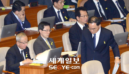 | 정홍원 국무총리(오른쪽)가 20일 국회 본회의에서 진행된 세월호 참사 긴급현안질문에 답변하기 위해 연단으로 걸어가고 있다. 남정탁 기자 |