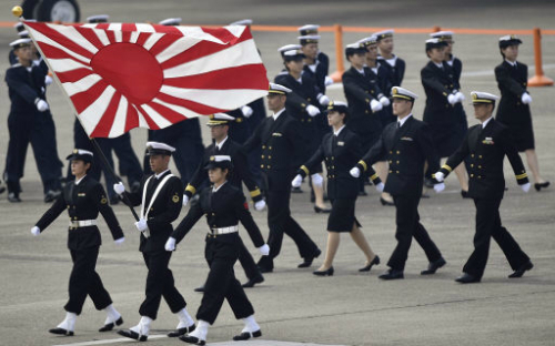 | 일본 항공자위대 창설 60주년인 지난해 10월26일 이바라키현 오미타마의 햐쿠리 공군기지에서 열린 기념식에서 항공자위대원들이 전범기(욱일승천기)를 들고 행진하고 있다. 연합 |