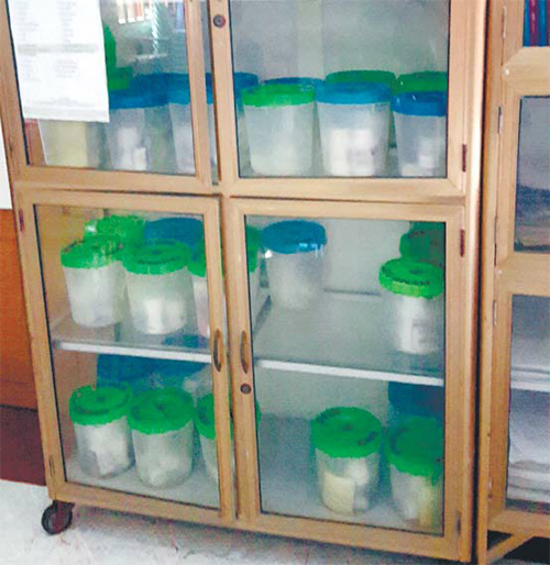 | 캄보디아 수도 프놈펜에 위치한 HOF 실내에 있는 아이들의 약통들. 약통마다 아이 이름이 적혀있다. |