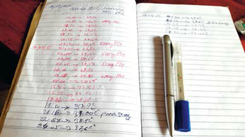 | 로니(14·가명)의 체온 기록 노트. 열이 나는 날이면 새벽부터 매 시간 확인해 꼼꼼히 기록한다. |