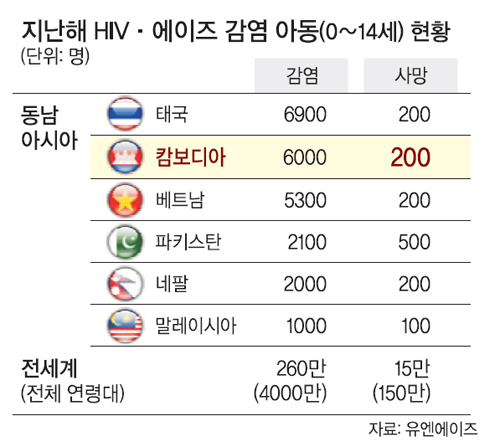 동남아에서는 캄보디아 등이 취약국으로 꼽힌다. 캄보디아는 최근 신규 발병률은 감소 추세지만, 정부가 대책을 늦게 수립하면서 이미 많은 환자가 발생했다. 훈센 총리가 “에이즈는 수십년의 전쟁보다 이 나라에 더 많은 해를 입혔다”고 말한 것도 이 같은 맥락에서다. 캄보디아의 작년 기준 HIV 감염인은 7만6000명인데, 특히 성매매 여성의 감염율은 10%가 넘는다. 한국도 안전지대는 아니다. 질병관리본부 통계를 보면 작년 1081명의 신규 감염인이 발생했다. 지난해 말까지 누적 감염인은 1만1504명에 이른다. 작년 한 해 동안 10∼14세 아동 1명, 15∼19세 청소년 39명이 각각 신규 감염자로 등록됐다.