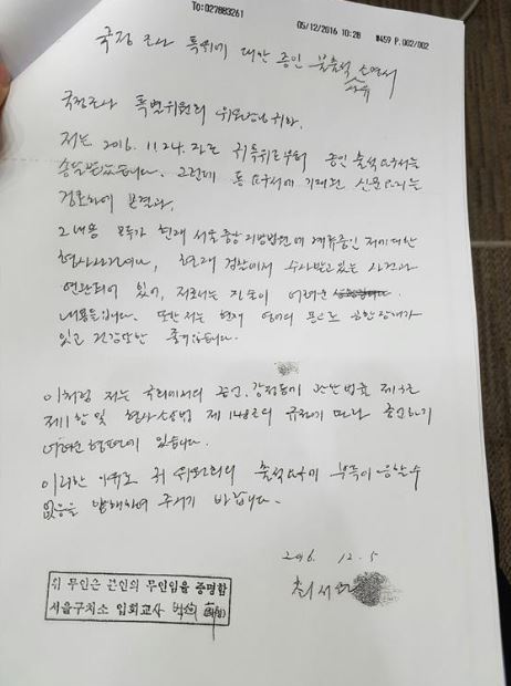 최씨가 직접 자필로 적은 불출석 사유서를 보면 “그 내용 모두가 현재 서울 중앙 지방법원에 계류 중인 저에 대한 형사사건이나, 현재 검찰에서 수사 받고 있는 사건과 연관되어 있어, 저로서는 진술이 어려운 내용들입니다. 또한 저는 현재 영어의 몸으로 공항장애가 있고 건강 또한 좋지 않습니다.”라고 적혀 있다.