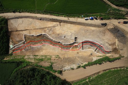 | ◇한반도에서 가장 오래된 것으로 보이는 청동기시대 관개수로인 ‘저전리 유적’. 이 관개수로는 1호 저수지(아래)와 2호 저수지(위쪽) 장축을 따라 관통하는 형태(붉은선)로 확인됐으며, 기어가는 뱀 같은 모양이고 단면은 V자형이다. |