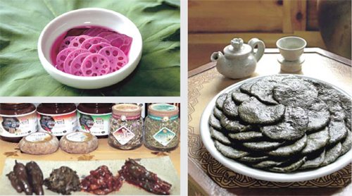 | ◇‘충청도 지역 사찰음식 현장 설명회’에서 소개된 보탑사의 쑥개떡(오른쪽)과 정토사의 연근 초절임(왼쪽 위) 등 사찰 일상식. |
