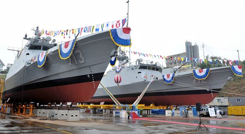| 늠름한 자태 최첨단 유도탄고속함 2·3번함인 한상국, 조천형함이 23일 진해에 위치한 STX조선해양 부두에서 진수식을 가졌다. 해군은 2002년 6월 29일 제2연평해전 당시 북한군에 맞서 싸우다 전사한 한상국, 조천형 중사를 기리기 위해 고속함에 이들의 이름을 붙였다. 해군 제공 |