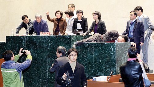 이 모습은 지난해 7월 한나라당이 민주당 의원들의 격렬한 반대 속에 미디어 관련법을 통과시키던 모습을 연상시켰다.