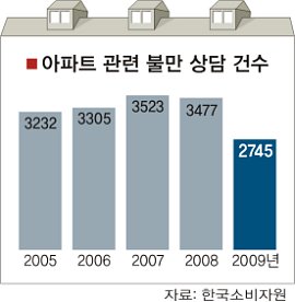 22일 한국소비자원에 따르면 지난 한해 동안 이곳에 접수된 아파트 관련 불만 상담은 총 2745건이었다. 이는 2008년 3477건에 비해 732건이 준 것이다. 분양가 상한제가 도입된 2007년 3523건에 비해선 778건 감소한 것이다. 아파트 관련 불만 상담이 2년 새 22% 감소한 셈이다. 그 이전 아파트 관련 불만 상담은 2005년 3232건, 2006년 3305건이었다. 아파트 관련 불만 상담은 분양가 상한제 도입 시점에서 정점을 찍은 이후 줄곧 감소 추세다.