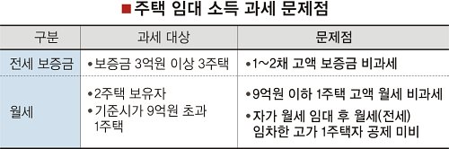 내년에 과세되는 주택 전세보증금의 경우 고가주택 기준이 없어 1∼2채를 보유한 사람은 아무리 많은 보증금을 받더라도 세금을 내지 않는가 하면 월세 과세에선 소득기준 미비로 고액 월세 소득자가 비과세되는 허점을 드러내고 있다.