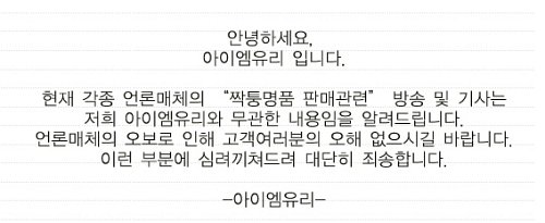 백지영과 유리가 함께 운영하는 온라인 쇼핑몰 ‘아이엠유리’는 9일 “현재 각종 언론매체의 ‘짝퉁명품 판매관련’ 방송 및 기사는 저희 아이엠유리와 무관한 내용임을 알려드린다”면서 “언론매체의 오보로 인해 고객 여러분의 오해 없으시길 바란다”는 공지를 내걸었다.