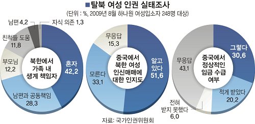탈북 여성들이 북한을 벗어나 정착하는 과정에서 온갖 인권침해로 고통받는 것으로 나타났다. 특히 탈북 후 중국이나 제3국에서 체류하는 동안 인신매매와 성폭력 등에 시달리는 일이 많았다. 국가인권위원회는 지난해 탈북 여성 26명과 하나원에서 생활하는 여성 입소자 248명을 대상으로 인권침해 실태를 조사한 뒤 보고서로 만들어 22일 발표했다.