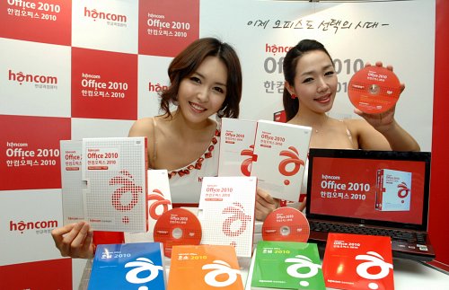 ◇최근 서울 소공동 조선호텔에서 열린 한글과컴퓨터 신제품 발표장에서 모델들이 한컴오피스2010를 선보이고 있다. |