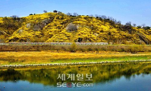 5일 완연한 봄날씨 속에 노란 개나리꽃이 서울 성동구 응봉산을 가득 덮은 풍경 아래로 중앙선 열차가 유유히 지나가고 있다.