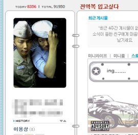 | ◇이용상 병장의 미니홈피에는 해군 제복을 입고 찍은 사진과 함께 ‘전역복 입고 싶다’는 제목이 적혀 있다. |
