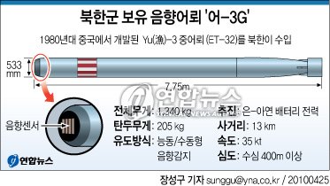 Yu-3는 길이 7.8m, 지름 533㎜, 탄두중량 205㎏, 항속 35노트, 사거리 13㎞의 음향유도 어뢰다.