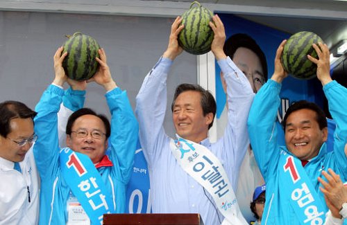 | ◇한나라당 정몽준 대표(오른쪽 두번째)가 28일 경남 밀양시 삼문동 사거리에서 이 지역 특산물인 ‘달고나 수박’을 머리 위로 번쩍 들어 이달곤 경남도지사 후보 지지를 호소하고 있다. 밀양=연합뉴스 |