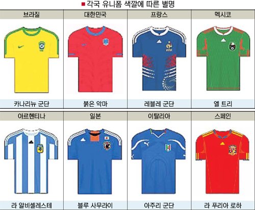 이와 함께 흰색과 하늘색을 뜻하는 아르헨티나의 ‘라 알비셀레스테’, 세 가지 색깔이라는 멕시코의 ‘엘 트리’, 흰색과 붉은색을 상징하는 파라과이의 ‘라 알비로하’ 등 국기 색깔에서 따온 별명도 있다.