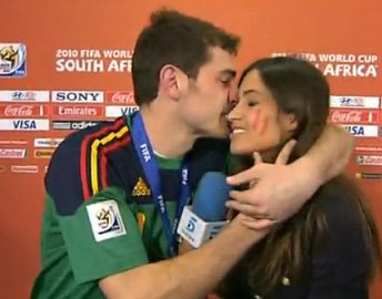 카시야스는 이날 소감을 말한 뒤 감격에 겨워 눈물을 글썽이며 갑자기 애인이자 리포터인 사라 카르보네로(26)의 뺨과 얼굴에 키스했다.