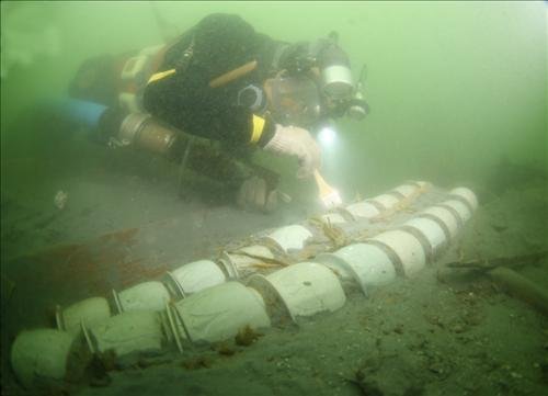 이들 청자매병은 뱃머리 오른쪽에서 아래위로 겹쳐진 채 발견됐다. 그 중 한 점은 최고급 상감청자로 밝혀졌다.