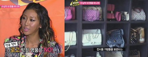 유명한 명품들은 단순한 일상품일 뿐 남들은 한 개 가지기도 힘든 명품 백들을 색깔별로 구입한 그녀는 되려 "가방에 매직으로 나만의 문구를 써볼 생각이다"라며 일종의 장난감을 대하는 모습이었고, 웨이팅 기간만 6개월에서 1년 이상 걸리며 내로라하는 연예인들도 소장하기 힘든 명품백 중에서도 최고가로 꼽히는 타조 가죽 백을 색깔별로 소지하고 있다고 밝혔다.