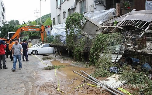 이 아파트 주민들에 따르면 집중호우가 내리기 시작한 21일 낮 1시께 아파트단지 뒷마당의 축대가 붕괴되면서 그 아래 주차돼 있던 주민 차량 10대가 파손되는 사고가 일어났다.