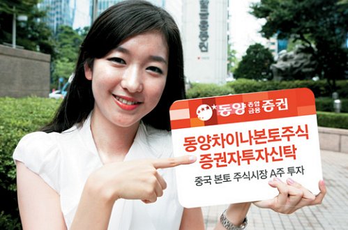 | ◇동양종합금융증권 여직원이 중국 본토 A주식시장에 주로 투자해 주가 상승에 따른 수익을 추구하는 ‘동양 차이나본토주식펀드’를 소개하고 있다. 지난달 15일 설정 첫날부터 150억원이 몰린 이 펀드는 동양자산운용이 운용한다. 동양종금증권 제공 |