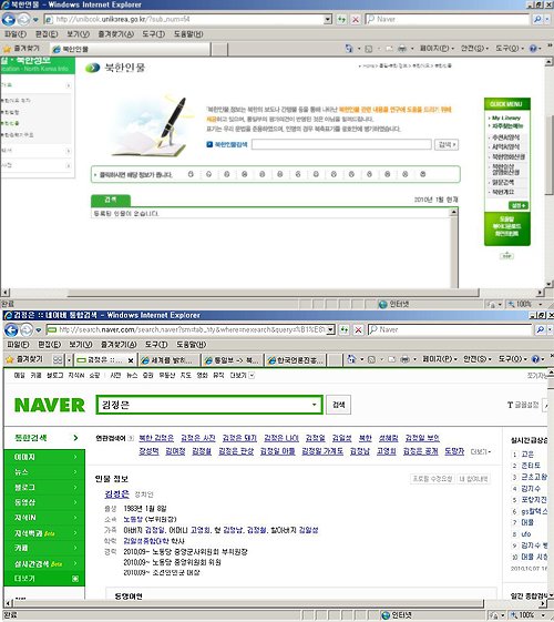 | ◇‘김정은’에 대한 인물정보 검색 결과. 통일부 홈페이지 인물정보(위)에는 “등록된 인물이 없다”고 나온 반면 포털사이트(아래)에서는 최근 직위까지 반영한 정보를 제공하고 있다. |