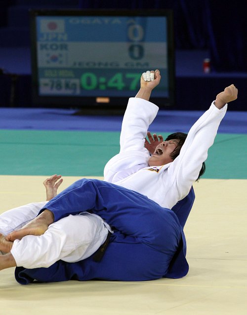| 여자 유도 정경미가 13일 오후 중국 광저우 후아공체육관에서 치러진 아시안게임 유도 78㎏ 이하급 결승전 일본의 오가타를 상대로 한판승을 거둔 뒤 환호하고 있다. 연합뉴스 |