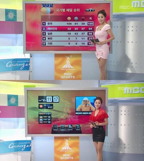 원자현 리포터는 18일 아시안게임 특집프로그램에 출연하면서 몸매가 훤히 드러나는 초미니 원피스를 입었다. 앞선 17일에는 분홍색 상의와 하늘색 미니 원피스, 또 다른 의상으로 붉은 레이스로 장식된 상의와 검은색 미니원피스를 입어 몸매의 굴곡을 드러냈다.