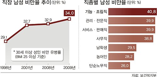 특히 남성은 관리·전문직종과 서비스·판매직종의 비만율이 39.9%, 사무직종은 38.8%, 기능·조립직종은 40.8%로, 직장인 남성 10명 중 4명이 비만상태였다. 이는 세계에서도 높은 것으로 알려진 미국 성인의 비만율 27%보다도 훨씬 높은 수치다.