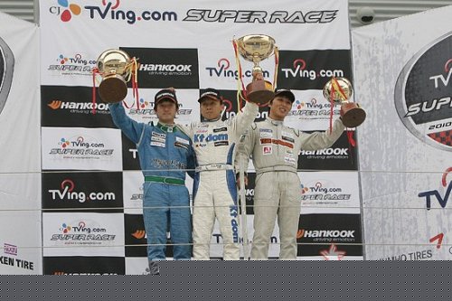 [세계닷컴 제휴사=탑라이더]21일 오후 전라남도 영암 코리아인터내셔널서킷에서 열린 'CJ 티빙닷컴 슈퍼레이스 챔피언쉽 6전' 슈퍼 2000클래스에서 'KT dom' 소속 박시현 선수가 우승을 차지 하였다.